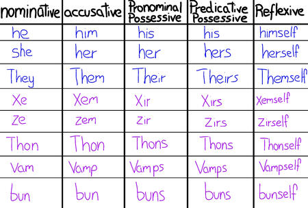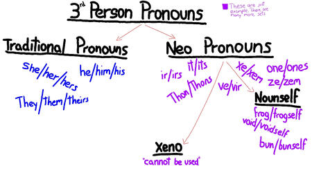 Neopronouns: Neopronouns are sets of "new" singular third-person pronouns who aren't officially recognized as part of the language yet. For example, in english, any sets of third-person pronouns that aren't he/him, she/her or they/them are neopronouns. The same concept also apply in a lot of other languages.